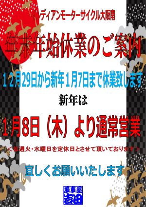 今年もこの様なご案内をさせて頂かないといけない時期になりました。年内は12月29日からお休みさせて頂き、年始は1月8日から平常通りの営業させて頂きます。